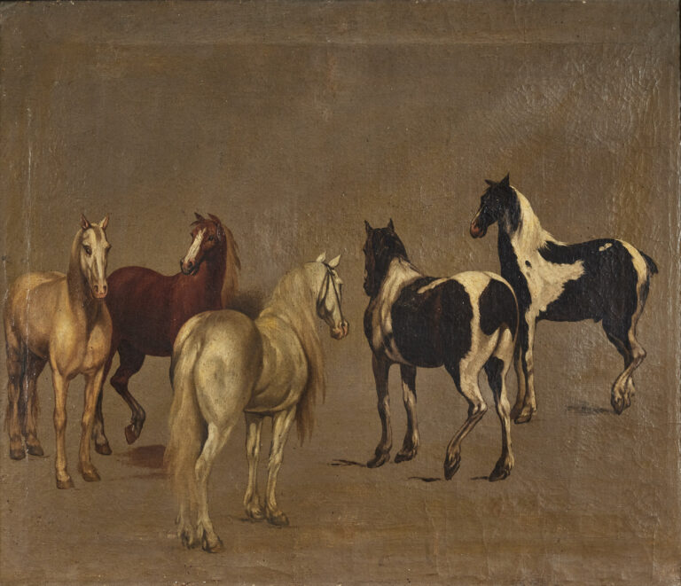 Two Cocks fighting in a Farmyard, a Pheasant and two Hens nearby