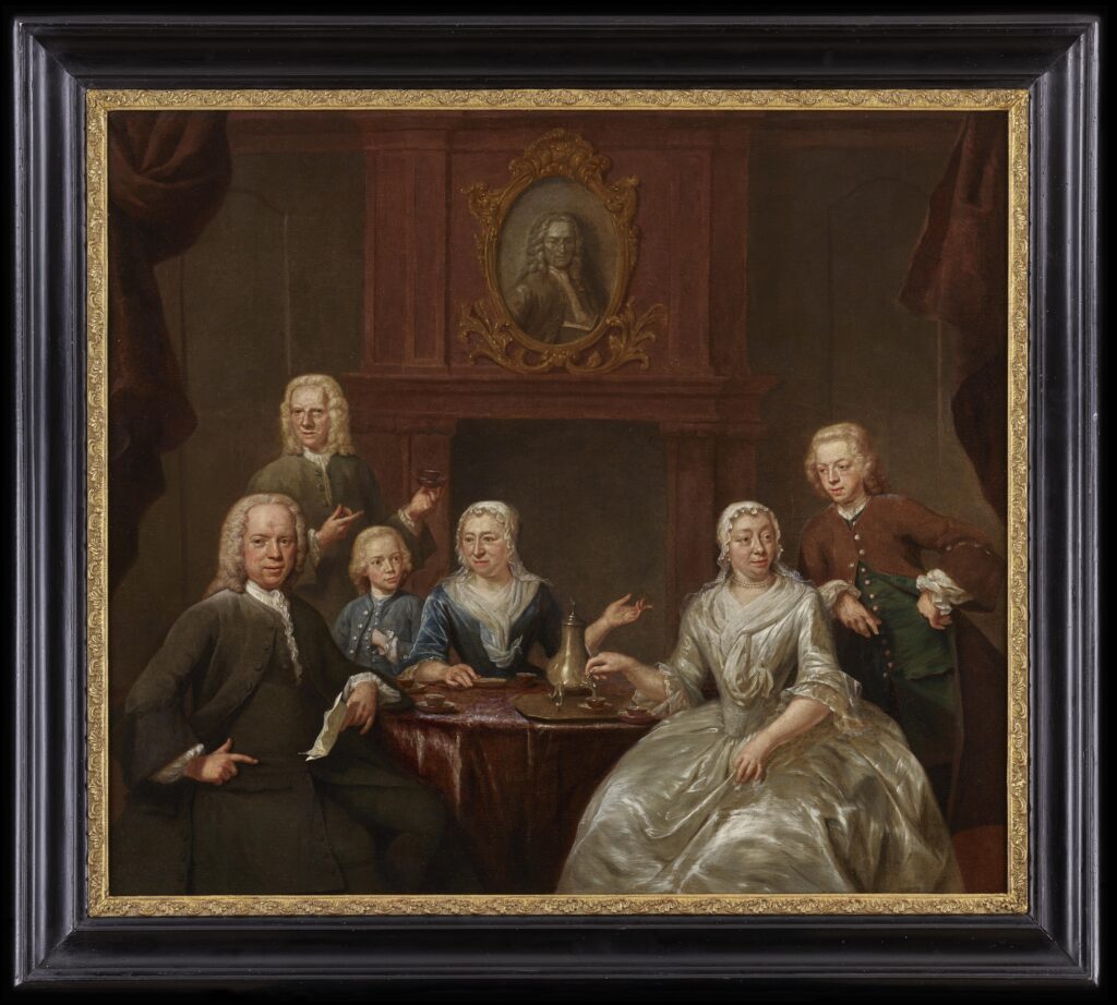 A Conversation Piece with a Family seated at a Table with a Coffee Service, a Portrait of a Gentleman over the Mantelpiece