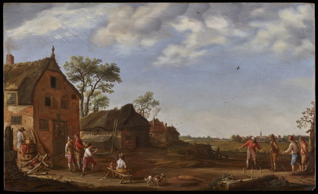 Skittles was a popular subject amongst Dutch painters of the 1600s such as Jan Steen, David Teniers II, and particularly the Haarlem school to which Heemskerk's father belonged. Depicting the game allowed genre painters to transplant their typical tavern boors from dark smoky interiors and spread them out around more expansive innocuous settings. Outside at play the tavern scene is transformed into a landscape while retaining a sense of mischief and fun.