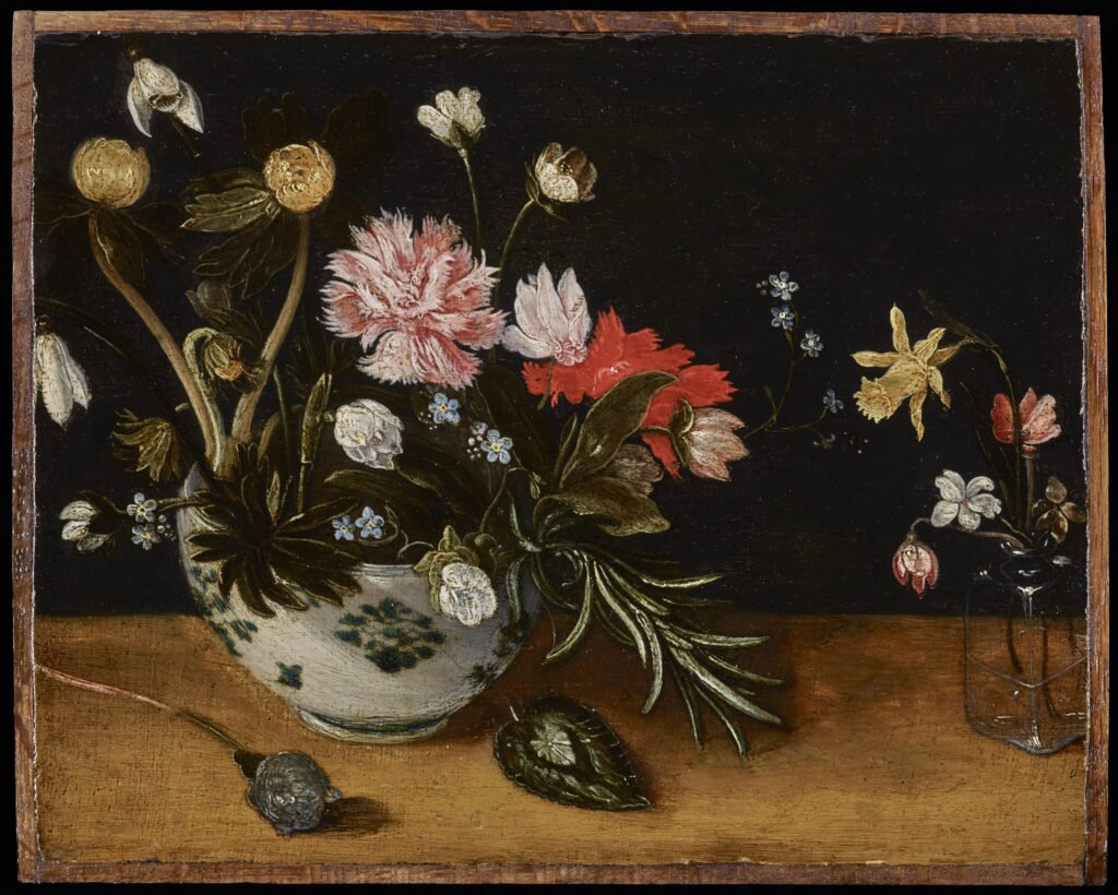 The compositional arrangement of a large bouquet to the left of the picture and a smaller one with tall, spindly flowers to the far right was employed by both Jan Brueghel the Elder and Younger in some of their most sumptuous flower still lifes. See for instance 'Still Life of a Tazza with a Garland of Flowers, a Jewellery Box, and a Floral Bouquet in a Glass Vase' (Sotheby's, New York, 21 May 2025, lot 6) painted by father and son working together.