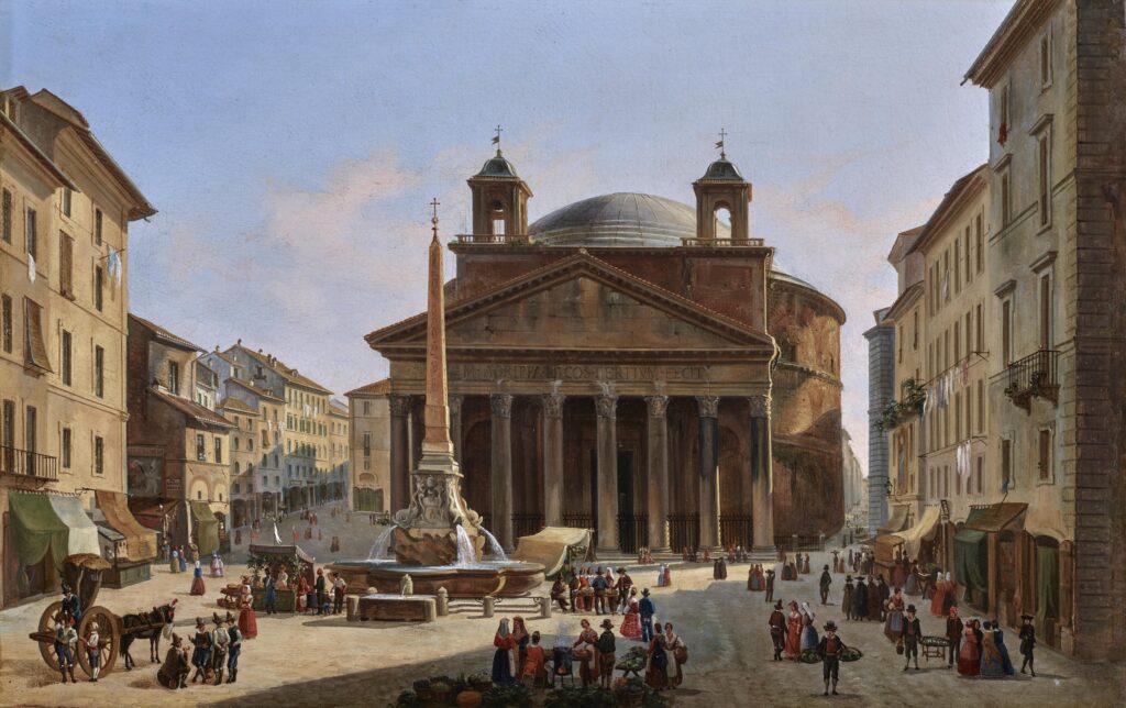 The delightful view of the Piazza del Pantheon presents itself as an idyllic slice of Roman life in the mid-1800s. Greatly differing from the depictions of earlier artists such as Piranesi with his ragged beggars and crumbling ruins, our artist presents a peaceful scene with food vendors, bustling shoppers, and Grand Tourists.
