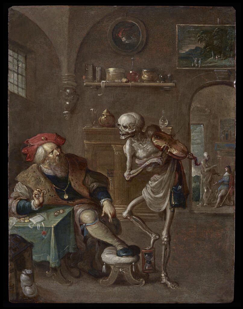 In one of Frans Francken's most iconic images Death plays his violin mocking the protestations of a wealthy old man. The Vanitas is also known as 'Death and the Merchant' or 'Fiddling Death', and Dr. Ursula Härting lists nine autograph versions of this image. While some are known to exist on panel, a few notable examples are painted on copper such as this picture and a version in the Wellcome Collection, London, with identical dimensions to the present work (inv. 45044i).