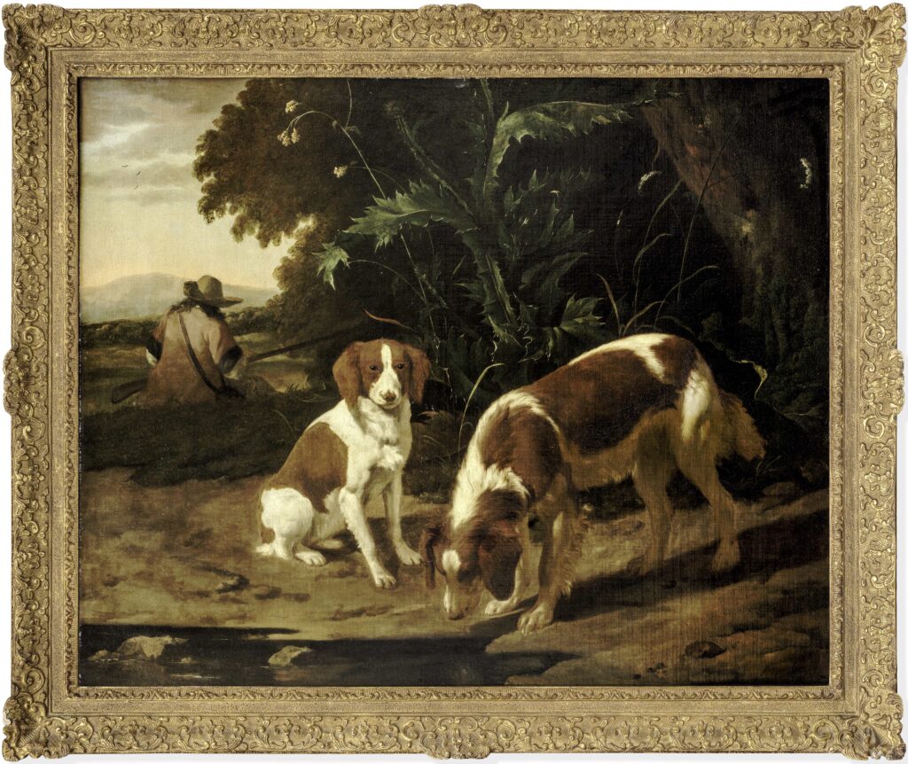 In this view of shoot two spaniels rest while their master cleans his gun on the grass. No partridge or other game have been collected as yet, so the viewer is left to suppose that the scene is in the early morning before the shoot has begun. The perspective is set low to the ground so that we are on level with the dogs among the weeds and earth giving the painting a hint of the sottobosco. The tall white flowers appear to be hemlock. Combined with the huge prickly thistle towering above the spaniels, the audience is reminded of the wild, rugged corners of the natural world and the adventurous nature of the shoot.